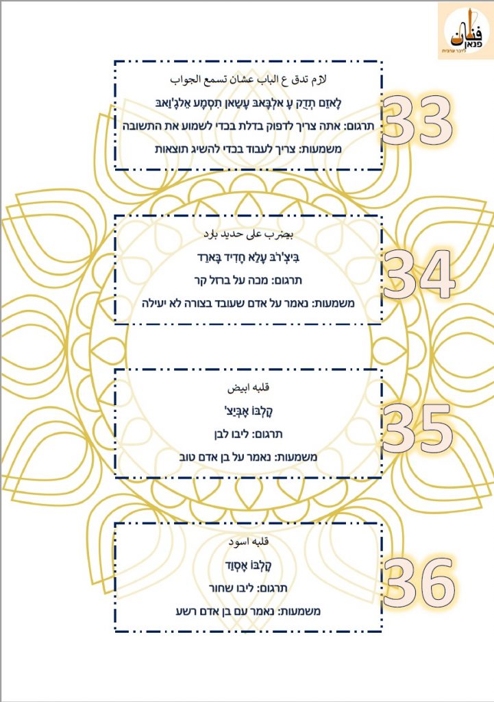 כל פתגם כתוב בערבית, תעתיק, תרגום ופירוש המשמעות בכדי שיהיה ניתן להבין כל מילה ומילה.