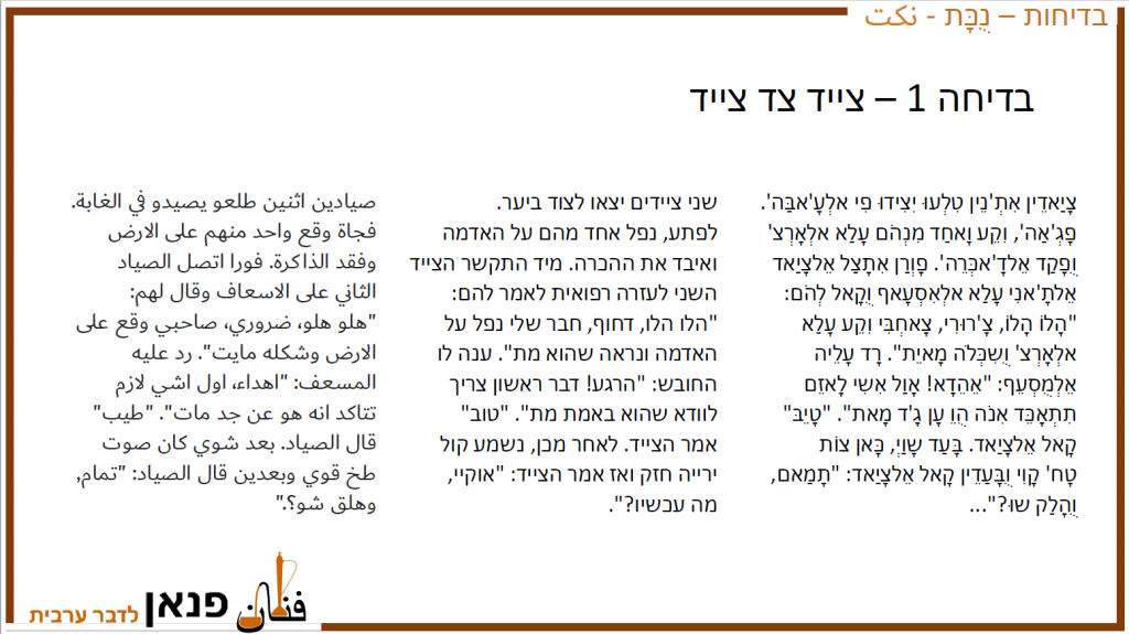 הבדיחות כתובות בתעתיק, עברית וערבית ולכל אחת מהן מצורף קישור לקובץ שמע, בעזרתו ניתן להבין בדיוק כיצד יש להגות את המילים.