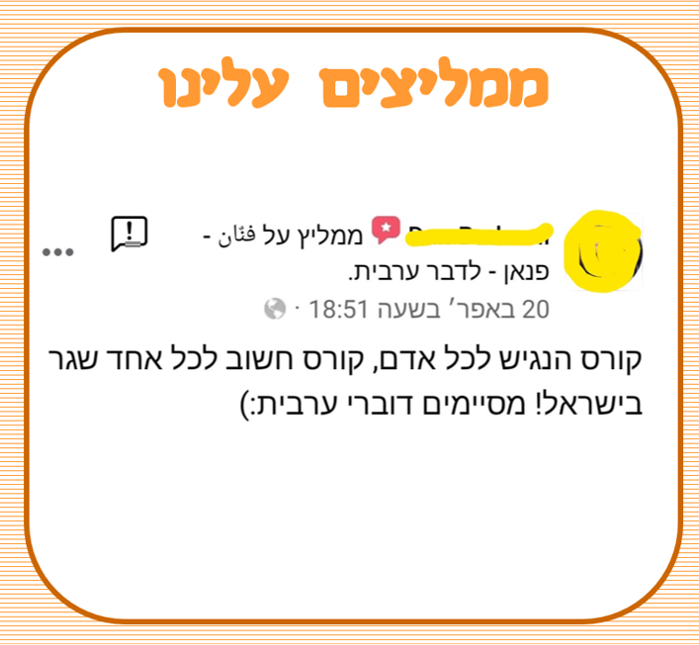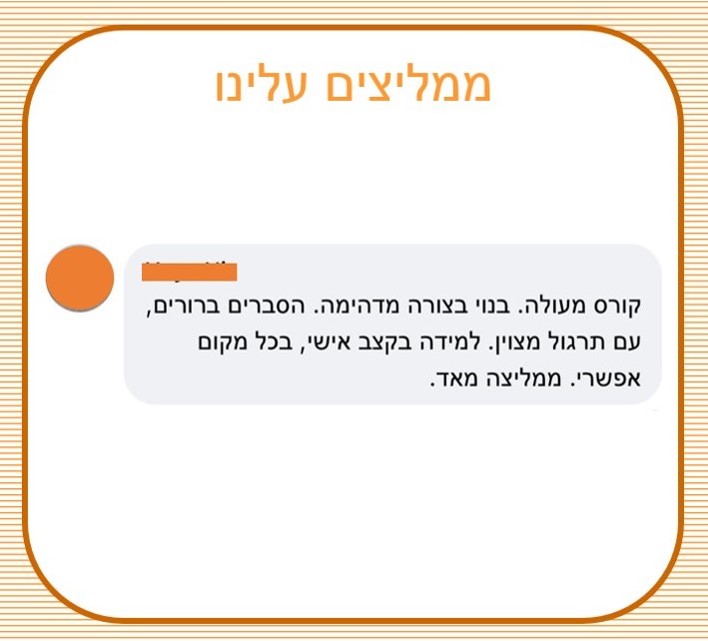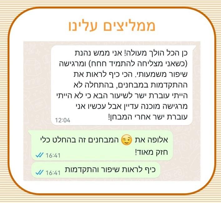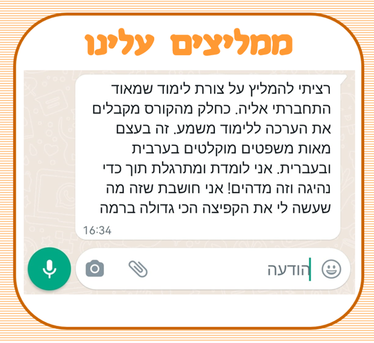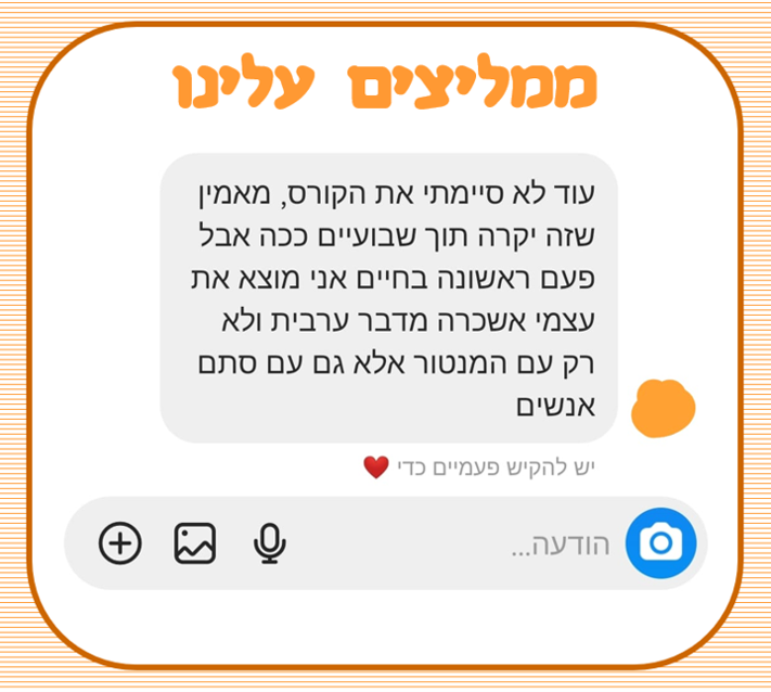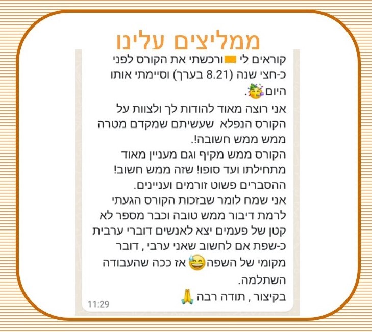 ליווי אישי בוואצאפ למשך שנה. זמינות מלאה בוואצאפ לתרגול של חומרי הקורס + תרגול הדיבור ושיפור השיחה בעזרת הקלטות קוליות. רוצים לראות איך זה נראה? לחצו כאן.