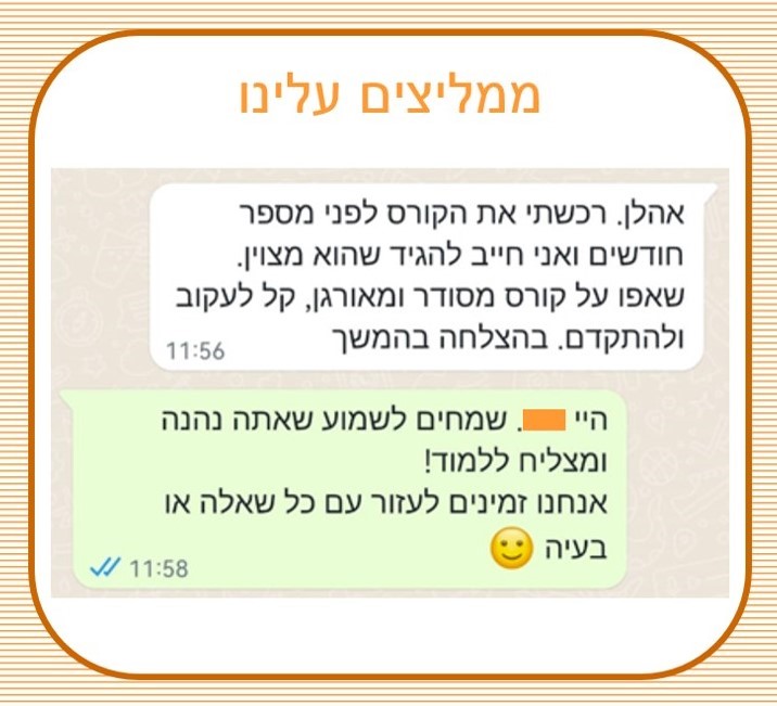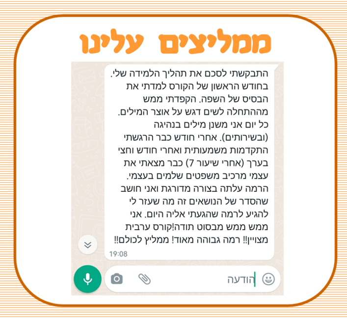 ליווי אישי בוואצאפ למשך שנה. זמינות מלאה בוואצאפ לתרגול של חומרי הקורס + תרגול הדיבור ושיפור השיחה בעזרת הקלטות קוליות. רוצים לראות איך זה נראה? לחצו כאן